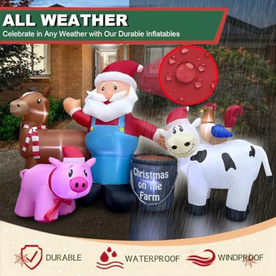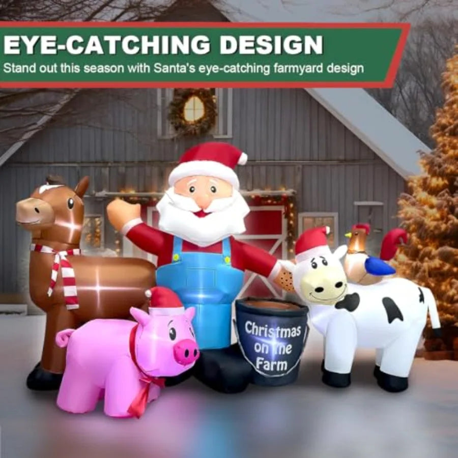 Festive Christmas Decoration: Our 8-foot Inflatable Farm Santa, accompanied by a cheerful horse, pig, cow, and chicken, is the perfect centerpiece for your outdoor Christmas decorations. Standing at 59 inches tall and measuring 95 inches in length and 33 inches in width, this charming Santa and his farm friends capture attention, making it a standout choice in your neighborhood